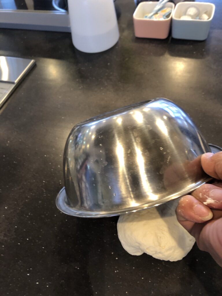 3.(2)を2等分して丸め、乾かないようにして1時間ほど寝かします。(私はボウルをひっくり返してその中に入れてます)