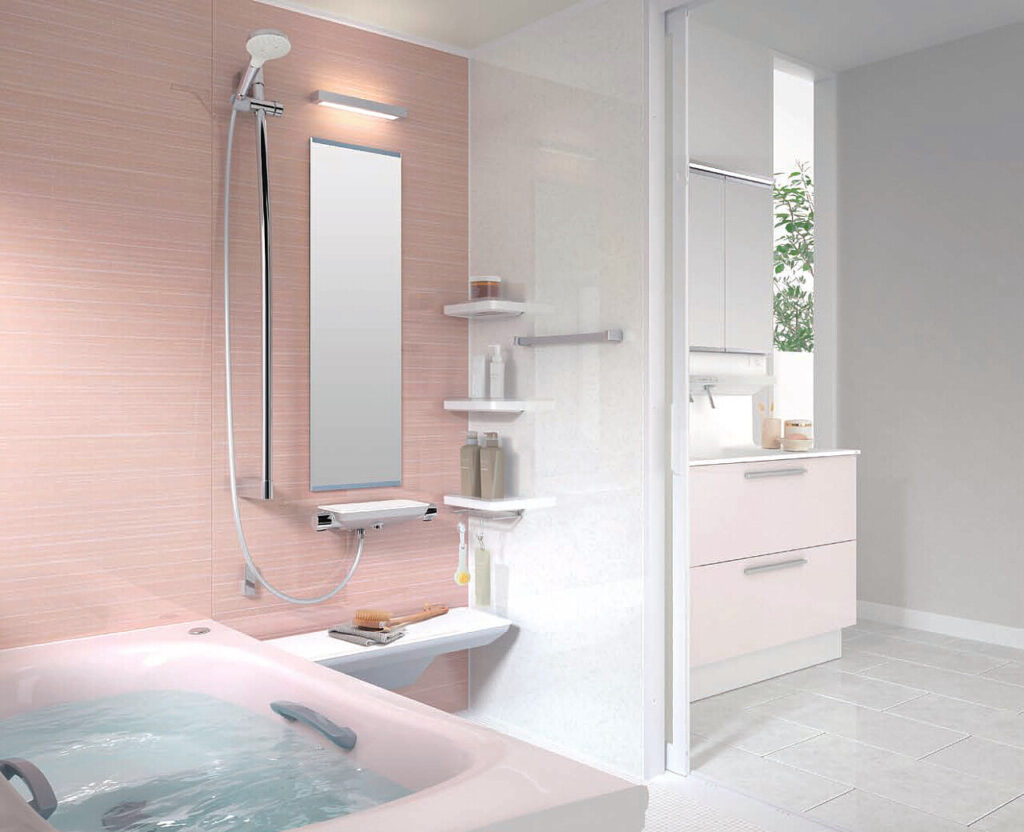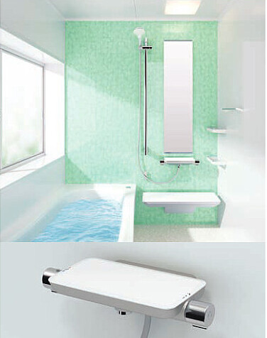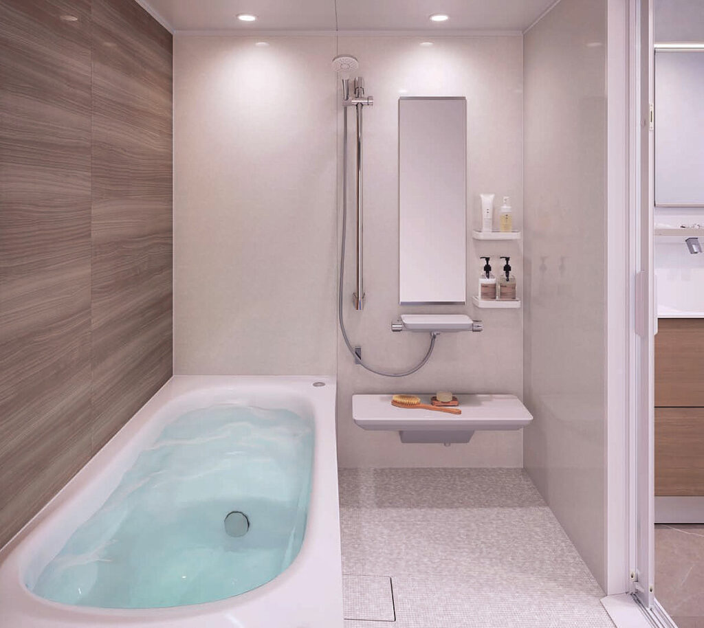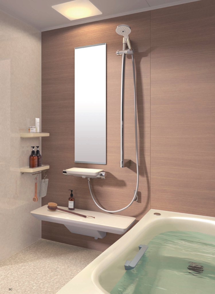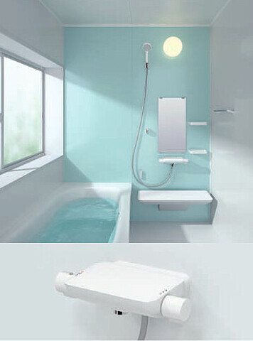 スッキリ棚水栓・浴槽ゴム栓/シャッター蓋・カラリ床・お掃除楽々排水口・半球型LED照明・コンフォートウェーブシャワー・シャワーハンガー・お掃除楽々鏡・収納棚2段・スッキリ折戸・換気扇